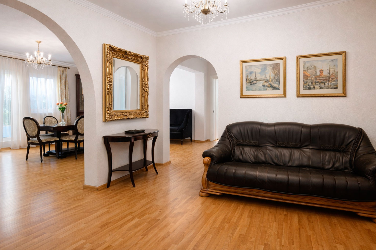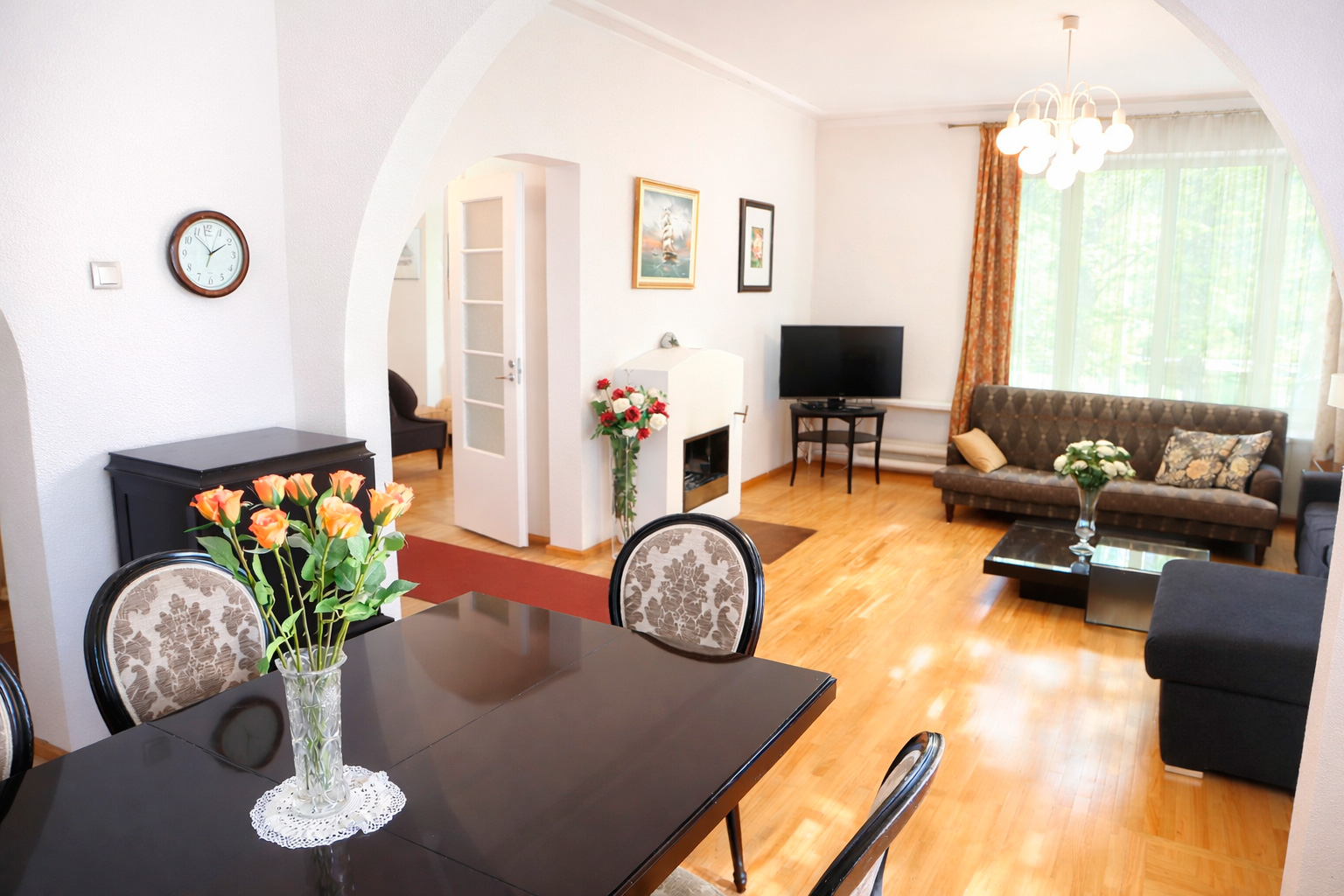 Tastefully combining modern furnishings with historical details, this spacious penthouse apartment offers a refined and comfortable stay. The apartment features a coffee machine, TV, and hairdryer. In addition to the bedrooms, it includes a fully equipped kitchen, living room, dining area, and two spacious bathrooms with walk-in showers. The apartment is recently renovated, bright, and fully equipped with all essential amenities. A private terrace overlooks the garden, swimming pool, and park. Restaurants and city life are just a short walk away, while the beach is only 10 minutes on foot. The Farmer’s Market and Rimi supermarket are nearby. It is ideal four adults and two children. Please send us request so that we can make you a personal offer. A true hidden oasis in the heart of Pärnu.